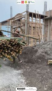 Kegiatan yang dilakukan adalah penurunan dan penataan bambu yang digunakan sebagai perancah serta penyangga cor lantai 2. Bambu-bambu tersebut berfungsi untuk memperkuat struktur pengecoran agar hasilnya lebih stabil dan tahan lama.