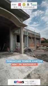 Alhamdulillāh, pembangunan Gedung MIM 1 PK Sukoharjo terus menunjukkan perkembangan yang signifikan. Pada Selasa, 10 Februari 2026, proses pembangunan telah memasuki tahap pengacian gedung, khususnya pada area tembok kantor sekolah. Tahapan pengacian ini merupakan proses perapian permukaan dinding setelah plesteran selesai dilakukan. Proses ini menjadi bagian penting untuk memperkuat struktur sekaligus memperindah tampilan bangunan sebelum memasuki tahap finishing berikutnya.